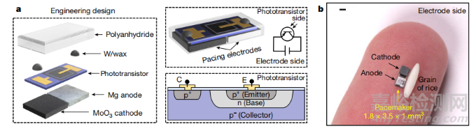 在可吸收生物電子設(shè)備領(lǐng)域,開發(fā)毫米級(jí)可降解光電系統(tǒng)以實(shí)現(xiàn)心臟電刺激具有重要意義。本研究通過構(gòu)建包含鎂合金陽極、三氧化鉬陰極和硅光敏晶體管的自供能心臟起搏器,結(jié)合無線光學(xué)控制機(jī)制,深入探究了可吸收材料在心臟起搏中的應(yīng)用潛力。研究發(fā)現(xiàn),該設(shè)備通過近紅外光激活,能夠在多種動(dòng)物模型中實(shí)現(xiàn)精確的心臟起搏,且無需外部電源,主要通過生物可吸收材料的電化學(xué)反應(yīng)提供動(dòng)力。實(shí)驗(yàn)表明,該設(shè)備在植入后可維持16天以上的穩(wěn)定運(yùn)行,且在植入后1.2至2.5年內(nèi)完全生物降解,無須二次手術(shù)取出。相關(guān)研究成果已發(fā)表在《Nature》期刊上,為未來可吸收醫(yī)療設(shè)備的設(shè)計(jì)和應(yīng)用提供了新的視角。