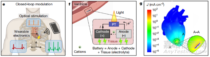 圖3. 通過外部光信號(hào)實(shí)現(xiàn)無線光學(xué)控制的閉環(huán)調(diào)節(jié)機(jī)制。光敏晶體管在光照下降低電阻,激活由陽極、陰極和組織電解質(zhì)構(gòu)成的原電池。