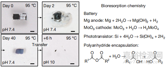 圖4. 設(shè)備的生物可吸收性及其降解過程。鎂陽極和三氧化鉬陰極分別生成氫氧化鎂和鉬酸,硅光敏晶體管和聚酸酐封裝材料最終降解為水溶性產(chǎn)物并被人體排出。