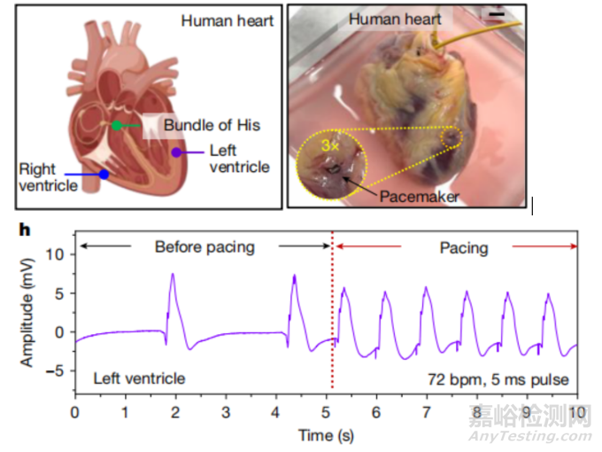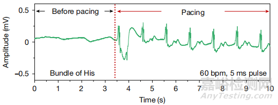 圖5. 起搏器在人體心臟模型中的應(yīng)用,以及起搏時(shí)的EDG信號(hào)(包括左心室、右心室和希氏束的起搏效果)。放置后效果良好。