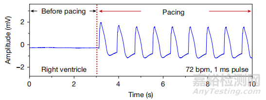 圖7. 在大鼠模型中的實(shí)驗(yàn)效果。ECG記錄顯示了設(shè)備在檢測到心率低于設(shè)定閾值(220 bpm)時(shí)自動(dòng)啟動(dòng)起搏,將心率提升到240 bpm。