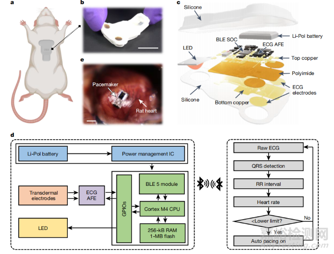 圖6. (a)在大鼠中的植入位置;(b)設(shè)備實(shí)物圖;(c)設(shè)備結(jié)構(gòu);(d)設(shè)備的硬件架構(gòu)和工作流程。在(d)中,設(shè)備通過透皮電極采集ECG信號(hào),經(jīng)過模擬前端(AFE)放大和濾波后,由Cortex M4 CPU進(jìn)行數(shù)據(jù)處理。CPU通過藍(lán)牙模塊將數(shù)據(jù)傳輸?shù)酵獠吭O(shè)備,并根據(jù)心率檢測結(jié)果自動(dòng)控制LED的光刺激,實(shí)現(xiàn)閉環(huán)調(diào)節(jié)。