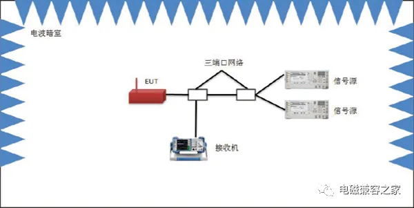 測(cè)試配置:利用兩臺(tái)信號(hào)源產(chǎn)生交調(diào)信號(hào),并在規(guī)定的頻率范圍內(nèi)掃描,檢查設(shè)備抗干擾能力。其中,接收機(jī)用來確認(rèn)信號(hào)是否是由信號(hào)源產(chǎn)生的雜波干擾。