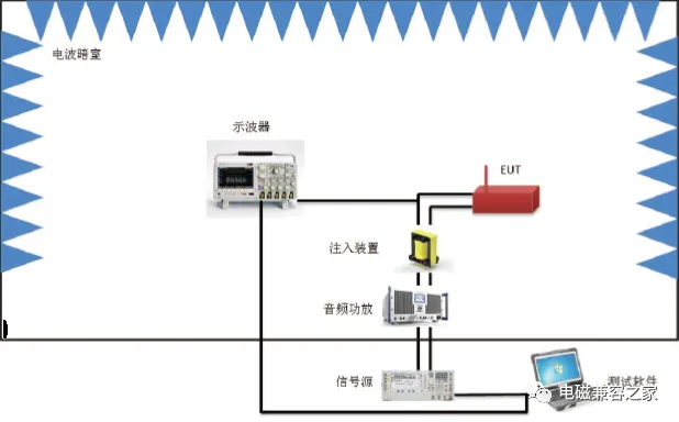 測(cè)試設(shè)備:信號(hào)發(fā)生器、音頻功率放大器、示波器、耦合變壓器、電容器10μF、隔離變壓器、精密電阻0.5Ω、;LISN含0.25μF耦合電容、數(shù)據(jù)記錄裝置。