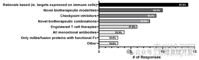 治療領域方面,免疫學/炎癥領域,100%藥企均會開展免疫毒性評價。腫瘤免疫治療領域,這一比例是15/16。非免疫治療抗腫瘤領域和抗感染領域這一比例就低很多,分別是8/16、3/16。
