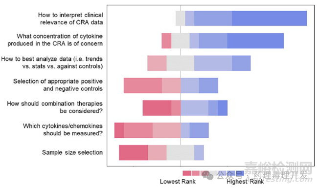 CRA的挑戰(zhàn)在于對結(jié)果的解讀。企業(yè)反饋排名最靠前的是如何解釋CRA結(jié)果的臨床相關(guān)性。說的直白點,臨床前CRA中細胞因子的升高,臨床一定會升高嗎?臨床前不升高,臨床一定不升高嗎?這中間的轉(zhuǎn)化效果和指導意義尚沒有統(tǒng)一的判斷標準。其次是CRA中細胞因子升高到什么濃度才會引起擔憂。不同機制免疫調(diào)節(jié)劑的免疫刺激作用是不同的,CD28激動型抗體明顯強于細胞因子,細胞因子大概率也比免疫檢查點抑制劑強。但很難判定具體某一因子升高到某一濃度,會引起比較大的擔憂。其它難點還包括如何分析數(shù)據(jù)(看趨勢還是進行統(tǒng)計分析)、如何選擇合適的陽性和陰性對照、聯(lián)合用藥如何考量、應該檢測哪些細胞因子/趨化因子等。