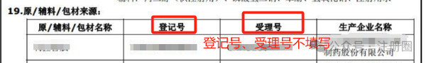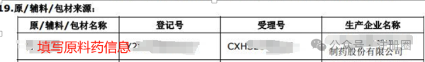 在填寫申請(qǐng)表時(shí),需在申請(qǐng)表19項(xiàng)下,填寫原料藥的名稱、登記號(hào)、受理號(hào)以及生產(chǎn)企業(yè)名稱信息。