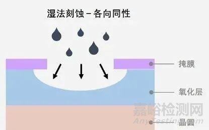 使用化學(xué)溶液去除氧化膜的濕法刻蝕具有成本低、刻蝕速度快和生產(chǎn)率高的優(yōu)勢(shì)。然而,濕法刻蝕具有各向同性的特點(diǎn),即其速度在任何方向上都是相同的。這會(huì)導(dǎo)致掩膜(或敏感膜)與刻蝕后的氧化膜不能完全對(duì)齊,因此很難處理非常精細(xì)的電路圖。