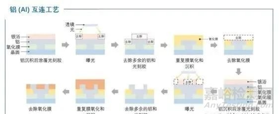 鋁互連工藝始于鋁沉積、光刻膠應(yīng)用以及曝光與顯影,隨后通過刻蝕有選擇地去除任何多余的鋁和光刻膠,然后才能進(jìn)入氧化過程。前述步驟完成后再不斷重復(fù)光刻、刻蝕和沉積過程直至完成互連。