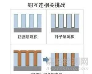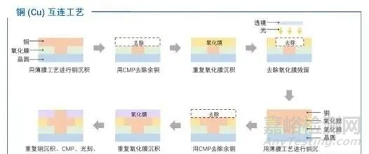 隨著銅原子不斷擴(kuò)散至電介質(zhì),后者的絕緣性會(huì)降低并產(chǎn)生阻擋銅原子繼續(xù)擴(kuò)散的阻擋層。之后阻擋層上會(huì)形成很薄的銅種子層。到這一步之后就可以進(jìn)行電鍍,也就是用銅填充高深寬比的圖形。填充后多余的銅可以用金屬化學(xué)機(jī)械拋光 (CMP) 方法去除,完成后即可沉積氧化膜,多余的膜則用光刻和刻蝕工藝去除即可。前述整個(gè)過程需要不斷重復(fù)直至完成銅互連為止。