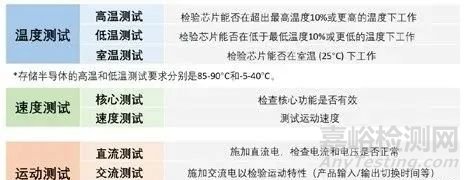 老化測(cè)試完成后就需要用探針卡將半導(dǎo)體芯片連接到測(cè)試裝置,之后就可以對(duì)晶圓進(jìn)行溫度、速度和運(yùn)動(dòng)測(cè)試以檢驗(yàn)相關(guān)半導(dǎo)體功能。具體測(cè)試步驟的說明請(qǐng)見表格。
