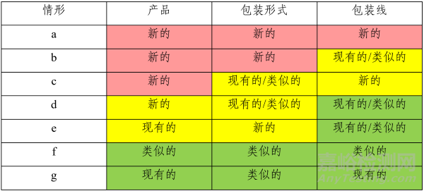 對于上述示例中的情形f/g,產(chǎn)品、包裝形式或包裝工藝、包裝線均為類似的或現(xiàn)有的,已具有豐富的產(chǎn)品知識和包裝工藝經(jīng)驗,經(jīng)評估各要素均為低風險,此種情形可能只需要進行1批次包裝工藝驗證。