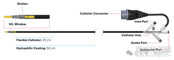 Javelin導管包含一個沖洗導管腔、一個導絲腔、一個加壓腔以及一個沖擊波發(fā)生器。