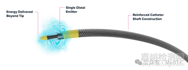 傳統(tǒng)球囊形的IVL對于嚴重鈣化狹窄病變基本上是無可奈何,因為這類IVL無法通過狹窄段,因此也無法發(fā)揮出IVL功效。為了解決這個問題,強生開發(fā)出一種非球囊形的IVL導管---Javelin,其采用單一遠端發(fā)射器設計,可產(chǎn)生超聲波沖擊波,其球形能量場延伸至導管尖端以外。相較于傳統(tǒng)球囊形IVL,這一創(chuàng)新設計使碎石能量更貼近高度狹窄的鈣化病變,從而通過沖擊波不斷震碎近端血管鈣化病變,逐步打通完全閉塞血管。