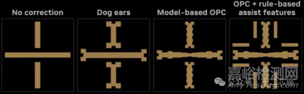 當(dāng)光源通過(guò)掩模版照射到光刻膠上時(shí),掩模版上的圖案就被轉(zhuǎn)印到了光刻膠上。這里有個(gè)有趣的地方:掩模版的圖案并不是直接等同于我們最終想要的電路圖案,因?yàn)樵谠O(shè)計(jì)時(shí)會(huì)考慮到光的干涉效應(yīng)(光學(xué)臨近效應(yīng),需要進(jìn)行OPC修正),所以掩模版的圖案會(huì)和實(shí)際電路圖案有些不同。如下圖,隨著器件尺寸的微縮,OPC也隨之復(fù)雜。