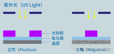 光刻工藝的第一步是在晶圓上涂光刻膠(Photoresist)。光刻膠是一種對(duì)光敏感的化學(xué)物質(zhì),經(jīng)曝光后其化學(xué)性質(zhì)會(huì)發(fā)生變化。具體而言,光刻膠在曝光后會(huì)在顯影液中的溶解度發(fā)生變化。曝光后溶解度上升的稱(chēng)為正性光刻膠(正膠),反之則為負(fù)性光刻膠(負(fù)膠)。