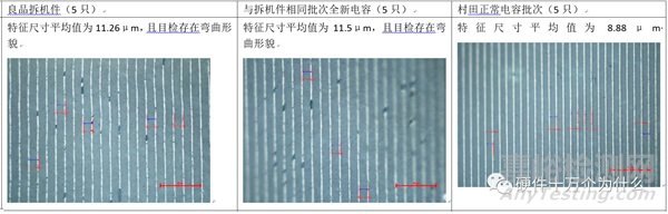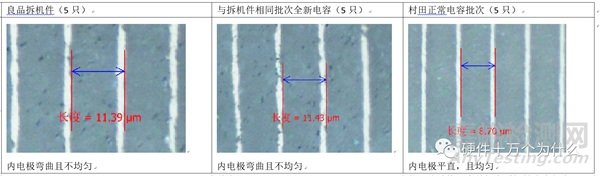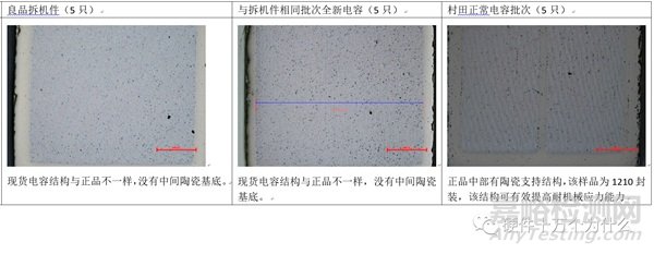 2、 進(jìn)行DPA( DPA分析(Destructive Physical Analysis)即破壞性物理分析,它是在電子元器件成品批中隨機(jī)抽取適當(dāng)樣品,采用一系列非破壞和破壞性的物理試驗(yàn)與分析方法),與正品進(jìn)行內(nèi)部形貌和特征尺寸的比較:MLCC容量和層數(shù)、電極間距等有關(guān),因此通過(guò)比較電極層數(shù)、電極間距、電極厚度和留邊尺寸等特征尺寸,可有效識(shí)別假冒MLCC。下表為某個(gè)案例中發(fā)現(xiàn)村田的假冒品,假冒品可能為X5R材質(zhì),而原村田規(guī)格為X7R材質(zhì),使用了該假冒MLCC后故障率顯著提高。