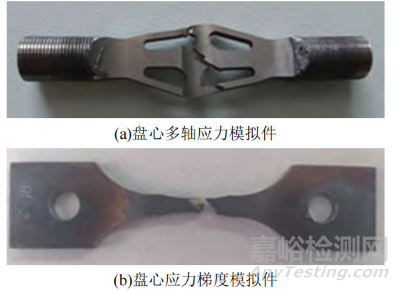 魏大盛等將周向應(yīng)力和軸向應(yīng)力比值和輪盤中心孔處周向應(yīng)力沿徑向的應(yīng)力梯度作為設(shè)計(jì)指標(biāo),設(shè)計(jì)了反映雙軸應(yīng)力狀態(tài)的多軸模擬件和反映應(yīng)力梯度的平板缺口模擬件(如圖10所示),建立了輪盤中心孔疲勞模擬件的設(shè)計(jì)方法。萬江艷等設(shè)計(jì)了反映輪盤榫槽底部應(yīng)力分布狀態(tài)的局部模擬試件,通過模擬件試驗(yàn)建立了基于材料延伸率的輪盤破裂準(zhǔn)則。