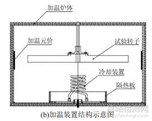 現(xiàn)有輪盤強(qiáng)度試驗(yàn)用加溫裝置多為上下爐盤式通用型大空間輻射加溫裝置,適用于不同結(jié)構(gòu)輪盤的超轉(zhuǎn)及低循環(huán)疲勞試驗(yàn)。Getsov等在WRD-500試驗(yàn)機(jī)上進(jìn)行了全尺寸渦輪盤的非比例熱機(jī)疲勞試驗(yàn),通過施加轉(zhuǎn)速為輪盤施加離心載荷,使用熱電偶為輪盤施加溫度。高漢晉等研制了一種渦輪盤加熱裝置,采用熱輻射的方式對渦輪盤試驗(yàn)組件進(jìn)行加熱,能夠?qū)啽P試驗(yàn)件加載均勻溫度場。