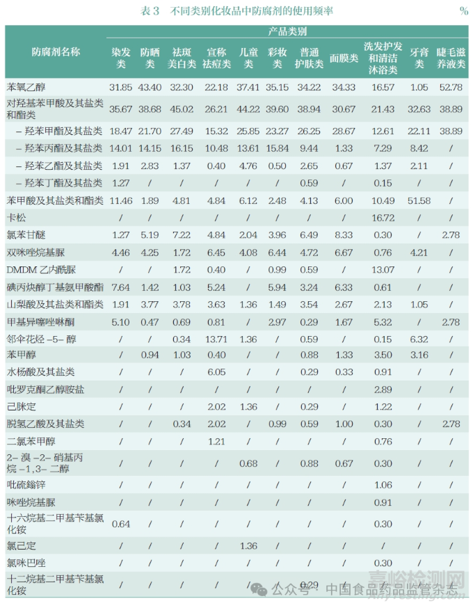 2.3 不同類別化妝品中防腐劑的使用情況