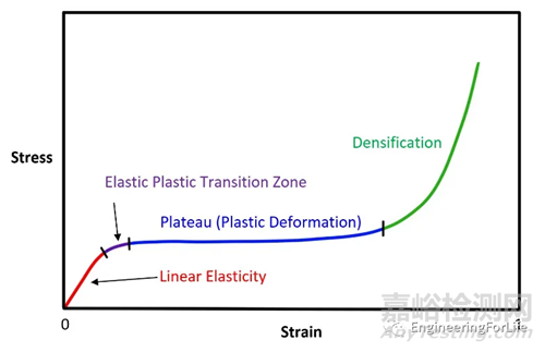 圖1 某些承受壓縮力的材料應(yīng)力和應(yīng)變之間的關(guān)系。在彈性變形區(qū)域,材料發(fā)生可完全恢復(fù)的彈性變形,應(yīng)力與應(yīng)變呈線性關(guān)系,符合胡克定律