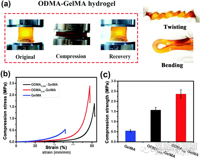 壓縮-卸載循環(huán)測試通常表征材料的抗疲勞性能。當材料為彈性體時,加載和卸載遵循相同的應(yīng)力-應(yīng)變曲線,并且不耗散能量(圖3a)。當材料為非彈性體時,加載和卸載遵循不同的應(yīng)力-應(yīng)變曲線,兩條曲線圍成的面積為材料單位體積的耗散能量(圖3b)(這里只考慮單軸應(yīng)力下材料的加載和卸載)。由于網(wǎng)絡(luò)和交聯(lián)的不均勻分布,大多數(shù)常規(guī)水凝膠容易出現(xiàn)輕微的裂縫和缺陷,并表現(xiàn)出脆性破壞。這種能量耗散機制,可以提高水凝膠的強度、韌性、抗疲勞性和對缺口不敏感性。