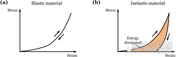 圖3 彈性和非彈性材料中的加載和卸載應(yīng)力-應(yīng)變曲線
