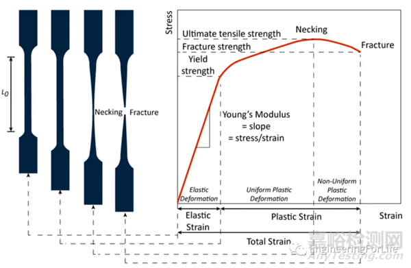 用于確定材料在施加斷裂載荷下的性能,通過使用壓盤或通用測試機上的專用工裝對試樣(一般為長方體或圓柱幾何體)施加壓縮壓力得到應(yīng)力-應(yīng)變圖,用于確定彈性極限、比例極限、屈服點、屈服強度和(對于某些材料)抗壓強度。從圖中選擇合適的應(yīng)變范圍,并對該區(qū)域內(nèi)曲線作斜率得到壓縮模量。圖1顯示了材料壓縮過程中的變化及應(yīng)力應(yīng)變曲線。
