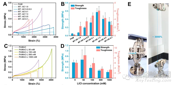 圖6 (A)PAM和不同比例PAMAC水凝膠的拉伸應(yīng)力-應(yīng)變曲線;(B)平均拉伸強度和韌性。(C)不同LiCl濃度水凝膠的拉伸應(yīng)力-應(yīng)變曲線;(D)平均拉伸強度和韌性。(E)水凝膠拉伸過程中的圖像