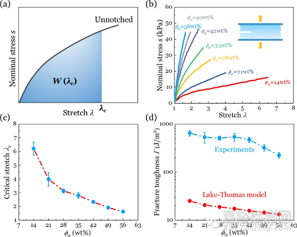 圖8 (a)純剪切試驗下凝膠斷裂韌性的計算。臨界拉伸是λC由缺口樣品的純剪切試驗確定。無缺口樣品的應(yīng)力-拉伸曲線的積分λ=1至λ=λC得到W(λC)。斷裂韌性計算為Γ=H×W(λC),H是未變形狀態(tài)下的樣品高度。(b)缺口樣品的應(yīng)力-拉伸曲線。(c)臨界拉伸λC隨著水凝膠φ0的增加而減少。(d)水凝膠的實驗斷裂韌性隨著φ0的增加而顯著降低