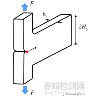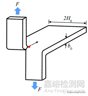 與純剪切實驗測試類似,此處未變形的樣品幾何形狀由長度L0、高度2H0和厚度b0定義。然而,不同的是,此處試樣在裂紋端的兩個臂被夾緊并剝離。