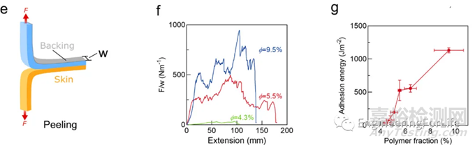 圖9 利用剝離實驗測試凝膠的粘附能(ΓA =2F/w)。(e)粘附能測量。(f)剝離力與拉伸的關(guān)系。(g)粘附能與聚合物含量的關(guān)系