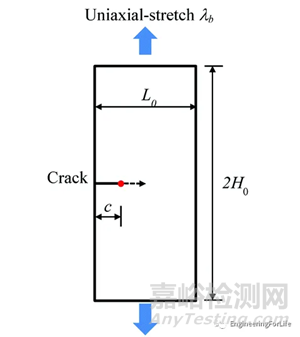 純剪切試驗測試首先由Rivlin和Thomas[1]提出,用于測試橡膠樣品的斷裂,最近已被用于表征水凝膠的斷裂。未變形樣品是寬L0,高2H0和厚度b0的細長條帶,其中L0? 2H0和b0。長度為c (c?2H0的長裂紋)位于夾在裝載裝置上的條帶的頂部和底部邊界之間的中間。