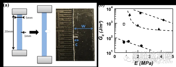 圖10 (a)在60°C和20°C下以0.025 s-1的應(yīng)變速率對單邊缺口樣品進行裂紋擴展實驗。(b)使用Greensmith的大應(yīng)變近似獲得臨界能量釋放率Gc
