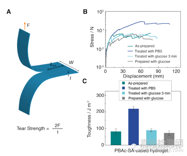 圖11 (A)量化水凝膠韌性的撕裂試驗示意圖。(B)撕裂試驗的力-位移曲線。(C)水凝膠生物粘接劑的韌性