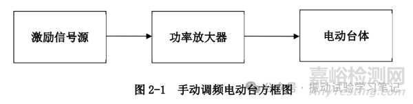 (1)手動(dòng)調(diào)頻電動(dòng)振動(dòng)臺(tái) 主要用于完成試驗(yàn)標(biāo)準(zhǔn)中規(guī)定的“耐共振頻率處理”和“耐預(yù)定頻處理”試驗(yàn)。它主要由激勵(lì)信號(hào)源,功率放大器(包括直流磁激電源)和振動(dòng)臺(tái)體(含冷卻系統(tǒng))三個(gè)部分組成,是一個(gè)開環(huán)控制系統(tǒng),如圖2-1。