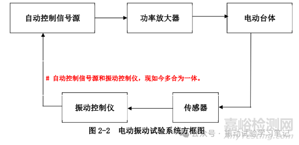 (2)自動(dòng)定振試驗(yàn)電動(dòng)振動(dòng)試驗(yàn)系統(tǒng) 是一個(gè)在試驗(yàn)過程中能夠自動(dòng)控制振動(dòng)參數(shù)量級(jí)的閉環(huán)控制系統(tǒng)。它的組成除要有功率放大器和電動(dòng)臺(tái)體(含冷卻系統(tǒng))之外,還需要有自動(dòng)控制信號(hào)源,振動(dòng)控制儀和傳感器三個(gè)部分,如圖2-2。