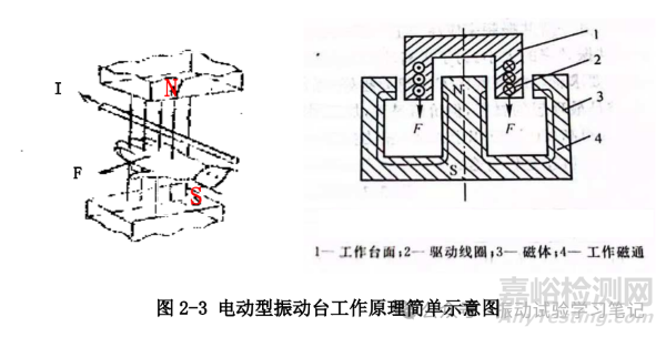 電動(dòng)振動(dòng)臺(tái)是將電能轉(zhuǎn)換為機(jī)械能的轉(zhuǎn)換器,基本工作原理是基于載流導(dǎo)體在磁場(chǎng)中受到電磁力作用的安培定律。其載流導(dǎo)體所受電磁力F與導(dǎo)體中的電流I,導(dǎo)體磁力線的方向用左手定則決定。如圖2-3,驅(qū)動(dòng)線圈置于磁體的空氣隙中,由左手則可知,驅(qū)動(dòng)線圈受力F作用使工作臺(tái)面產(chǎn)生向下運(yùn)動(dòng),如改變流過驅(qū)動(dòng)線圈中電流的方向,那么驅(qū)動(dòng)線圈受一與圖2-3所示方向相反的力F,使得工作臺(tái)面向上運(yùn)動(dòng),由此可知若在驅(qū)動(dòng)線圈中通過以交流電流時(shí),它將使工作臺(tái)面在磁場(chǎng)中產(chǎn)生相應(yīng)的交變運(yùn)動(dòng)。通常驅(qū)動(dòng)線圈中的交變電流是由可變頻率的激勵(lì)信號(hào)源經(jīng)功率放大器放大后供給,而恒定磁場(chǎng)可以由電磁或永磁產(chǎn)生,但多用電磁產(chǎn)生。電動(dòng)振動(dòng)臺(tái)除振動(dòng)臺(tái)本體外,還有配套的電器設(shè)備和電子儀器,如信號(hào)發(fā)生器、功率放大器、直流勵(lì)磁電源、冷卻系統(tǒng)等。信號(hào)發(fā)生器產(chǎn)生交變信號(hào),經(jīng)功放放大后,輸入到動(dòng)圈,它與磁場(chǎng)作用即產(chǎn)生一個(gè)交變的力F,推動(dòng)可動(dòng)系統(tǒng)運(yùn)動(dòng)。設(shè)電流i=Isinωt,則力為: