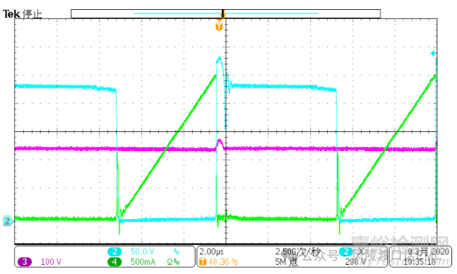 為解決勵(lì)磁電感與原邊MOS管D-S極間寄生電容的振蕩問題,在變壓器勵(lì)磁電感與原邊MOS管之間串聯(lián)磁珠,抑制高頻振蕩。下圖刪除串聯(lián)6mm磁珠后的測試波形,MOS管電流振幅有微小改變,而D極電壓振幅變大,振鈴也更加明顯。