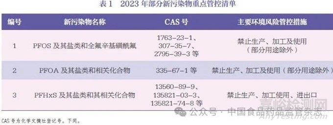 2019 年3 月發(fā)布的《關(guān)于禁止生產(chǎn)、流通、使用和進(jìn)出口林丹等持久性有機(jī)污染物的公告》中規(guī)定了PFOS 及其鹽類和全氟辛基磺酰氟除可接受用途外的生產(chǎn)、流通、使用和進(jìn)出口[32]。2022 年12 月,《重點(diǎn)管控新污染物清單(2023 年版)》[33] 發(fā)布,將3 類PFAS 列為重點(diǎn)管控新污染物,分別為PFOS 及其鹽類和全氟辛基磺酰氟、PFOA 及其鹽類和相關(guān)化合物、PFHxS及其鹽類和其相關(guān)化合物,具體清單信息見表1。2023 年10 月,《中國嚴(yán)格限制的有毒化學(xué)品名錄》(2023 年)[34] 發(fā)布, 該名錄將PFOS 類和PFOA 類列入。即凡進(jìn)出口PFOS 和PFOA 的企業(yè),需按照規(guī)定向生態(tài)環(huán)境部申請辦理有毒化學(xué)品進(jìn)(出)口環(huán)境管理放行通知單,且進(jìn)(出)口經(jīng)營者應(yīng)憑有毒化學(xué)品進(jìn)(出)口環(huán)境管理放行通知單向海關(guān)辦理進(jìn)出口手續(xù)。