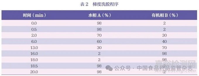 (1) 液相條件。色譜柱:ACQUITY UPLC® BEH C18 Column(2.1 mm×100 mm,1.7μm);流動相:2 mmol 甲酸銨(A)- 乙腈(B);流速:0.35 ml/min;進(jìn)樣量:3 μl;柱溫:40℃ ;梯度洗脫程序,見表2。