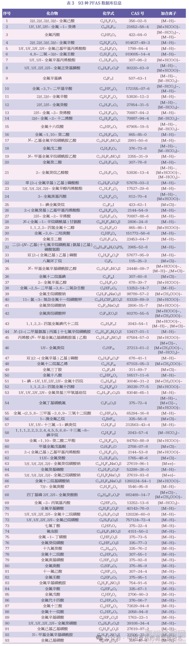 (2)質(zhì)譜條件。ESI 負(fù)離子模式;毛細(xì)管電壓:1 kV ;離子源溫度:120℃;錐孔電壓:20 V;脫溶劑溫度:550℃ ;錐孔氣流:50 L/h ;脫溶劑氣流:1000 L/h ;低碰撞能量:4 eV ;高碰撞能量:15~50 eV;質(zhì)量掃描范圍:50~1200 Da ;實(shí)時(shí)校正液:亮氨酸腦啡肽溶液(200 pg/μl)。93種PFAS 的數(shù)據(jù)庫信息,見表3。