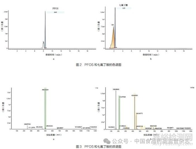 PFAS 在質(zhì)譜中通常脫去一個(gè)氫離子,形成[M-H]- 分子離子,以PFOS、七氟丁酸為例。PFOS(圖2a)在8.40 min 處出峰, 分析其質(zhì)譜圖信息( 圖3a),PFOS 的在質(zhì)譜中脫去一個(gè)氫離子, 形成[M-H]- 分子離子,其最強(qiáng)質(zhì)譜信號為m/z498.9304。類似的, 七氟丁酸在2.25 min( 圖2b) 處出峰,在質(zhì)譜中產(chǎn)生響應(yīng)m/z 212.9793( 圖3b), 均為[M-H]- 形式分子離子。其他化合物如1H,1H,2H- 全氟-1- 癸烯在質(zhì)譜中甲酸根離子結(jié)合, 生成[M+HCOO]- 形式的母離子;1-碘全氟癸烷在質(zhì)譜中和氯離子結(jié)合,形成[M+Cl]- 形式的母離子;1H,1H,2H,2H- 全氟癸烷磺酸鈉和1H,1H,2H,2H- 全氟己烷磺酸鈉結(jié)構(gòu)較為穩(wěn)定, 不易碎裂, 其在質(zhì)譜中和一個(gè)質(zhì)子相結(jié)合, 形成[M+e]- 形式的母離子。