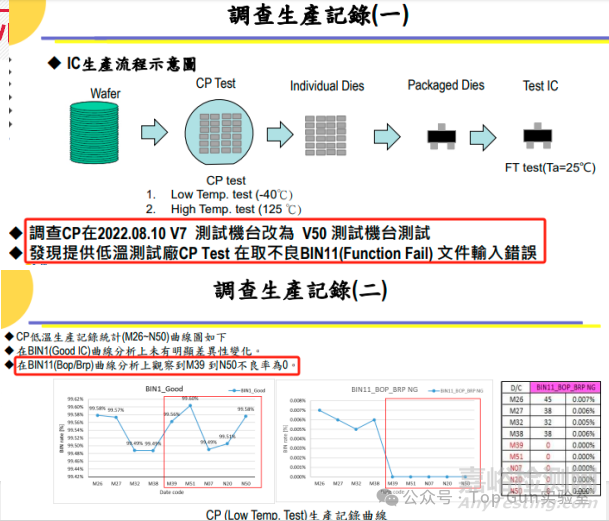 3)芯片原廠二次分析結(jié)論:故障芯片為test escape,根因?yàn)橄掳l(fā)給晶圓廠的測(cè)試文件要求錯(cuò)誤,導(dǎo)致某個(gè)不良的bin混入到良品。