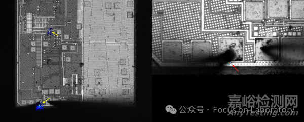 對故障復現(xiàn)樣品進行Thermal測試,可見pin1的ESD電路部分有異常亮點,且位置與市場失效基本一致。