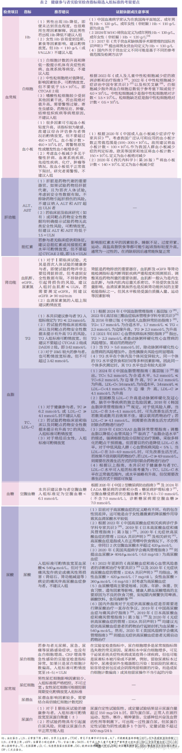 不伴有異常癥狀和體征的實驗室檢查結果異常是參與者篩選失敗的最主要原因, 約占34%~47%[21-22]。其中血生化指標異常的發(fā)生概率最高,其次是尿常規(guī)和血常規(guī)異常。血生化指標異常主要表現(xiàn)為肝功能、血脂和血尿酸的異常。實驗室檢查指標若出現(xiàn)異常,達到何種水平時不能入組,一直是困擾研究者、申辦者、檢查人員的主要問題和分歧點。有些實驗室檢查指標會受多種因素影響(如運動、飲食、睡眠、休息等)而出現(xiàn)生理性波動。關于一些常見實驗室檢查指標的篩選入組標準(此處特指不伴隨癥狀或體征) 的推薦意見, 見表2[8,23-44]。除了表2 已列舉的實驗室檢查指標,尚有許多其他指標未在此詳細說明,這些未列出的指標,可基于試驗藥物、研究方案及安全性風險總體把控等進行全面評估,一般而言,其接受范圍可適當放寬至正常參考值上限或下限的約20% 以內(nèi)。