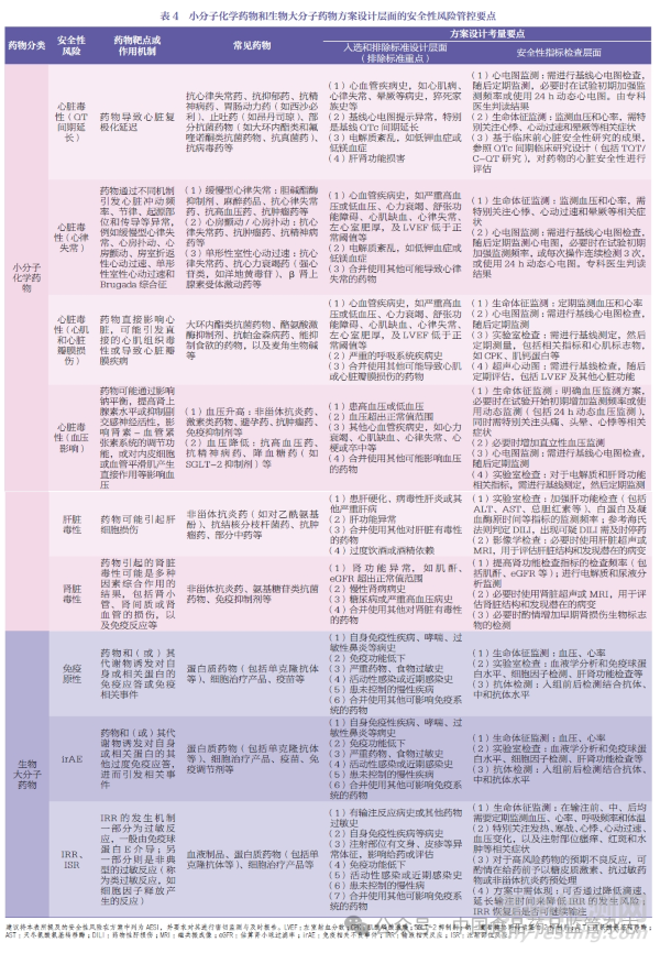 本共識針對小分子化學藥物和生物大分子藥物方案設計層面的安全性風險管控要點進行了簡要匯總,主要包括試驗藥物安全性風險、藥物靶點或作用機制、常見藥物以及方案設計考量要點等方面內(nèi)容,見表4。