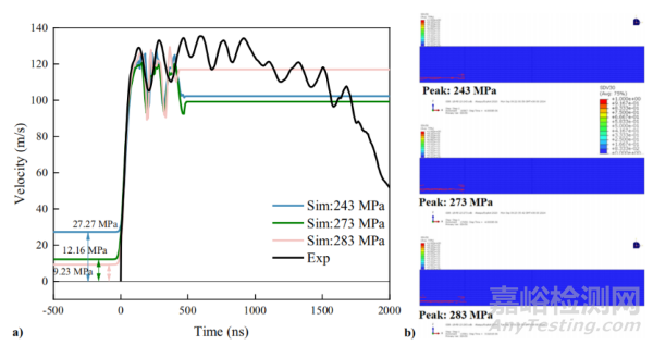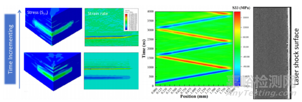 該方法主要包含三個(gè)方面:(1)復(fù)合材料三維各向異性模量、泊松比和強(qiáng)度與應(yīng)變率成正比且服從對(duì)數(shù)關(guān)系,實(shí)現(xiàn)了應(yīng)力波傳播規(guī)律的精確預(yù)測(cè);(2)失效準(zhǔn)則及損傷演化剛度折減均采用基于應(yīng)變控制的策略,解決了局部單元?jiǎng)偠韧嘶髴?yīng)力卸載導(dǎo)致應(yīng)變混亂的問(wèn)題;(3)成功預(yù)測(cè)復(fù)合材料厚度方向精確分層損傷位置、損傷后應(yīng)力波新的傳播形式以及背面粒子速度的變化,并將損傷和背面粒子速度與實(shí)驗(yàn)進(jìn)行對(duì)比驗(yàn)證,優(yōu)化反演得到合適的壓力-時(shí)間曲線峰值,對(duì)激光誘導(dǎo)沖擊波的激光參數(shù)溯源提供了參考。