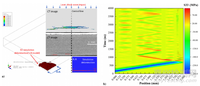 飛機(jī)復(fù)合材料結(jié)構(gòu)層間或膠結(jié)界面污染、粘接劑不均勻/老化等因素會(huì)導(dǎo)致“吻接”和“弱粘接”問(wèn)題,而現(xiàn)有超聲波、紅外等無(wú)損檢測(cè)技術(shù)無(wú)法有效檢測(cè)評(píng)估。激光誘導(dǎo)等離子體沖擊波檢測(cè)界面結(jié)合強(qiáng)度技術(shù) (LASAT) 是一種利用激光沖擊波反射拉伸波的力學(xué)效應(yīng)進(jìn)行界面結(jié)合強(qiáng)度定量性評(píng)估的新型檢測(cè)技術(shù),可有效解決“吻接”和“弱粘接”的檢測(cè)難題。納秒激光誘導(dǎo)的沖擊波壓力大、應(yīng)變率高、持續(xù)時(shí)間短,且在復(fù)合材料材料內(nèi)部各方向產(chǎn)生不均勻的應(yīng)力作用。這種不均勻短脈沖應(yīng)力作用下材料的響應(yīng)規(guī)律復(fù)雜,呈現(xiàn)出十分明顯的應(yīng)變率相關(guān)性,現(xiàn)有研究主要通過(guò)實(shí)驗(yàn)測(cè)試來(lái)描述不同應(yīng)變率條件下復(fù)合材料的力學(xué)性能與動(dòng)態(tài)響應(yīng)規(guī)律以及激光參數(shù)反演,而少量數(shù)值預(yù)測(cè)模型和方法均未考慮應(yīng)變率在復(fù)合材料各個(gè)方向的相關(guān)性。為此,航空動(dòng)力系統(tǒng)與等離子體技術(shù)全國(guó)重點(diǎn)實(shí)驗(yàn)室(APPL)聯(lián)合西北工業(yè)大學(xué)航空學(xué)院提出采用一種三維正交各向異性的應(yīng)變率本構(gòu)模型進(jìn)行超高應(yīng)變率沖擊波在復(fù)合材料內(nèi)部的傳播及失效預(yù)測(cè),并通過(guò)實(shí)驗(yàn)進(jìn)行了科學(xué)系統(tǒng)驗(yàn)證。