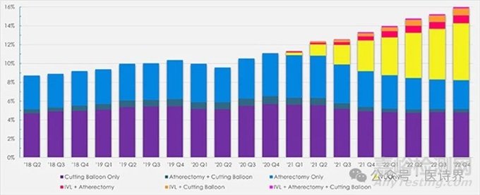 IVL通過(guò)能量波分解鈣化斑塊,以更低侵襲性實(shí)現(xiàn)更安全的血流重建。鈣化斑塊被粉碎后,血管順應(yīng)性提升,更有利于藥物涂層球囊/支架的精準(zhǔn)置入,從而最大化管腔獲得。最新研究顯示,不同IVL方法(包括在研版本)較傳統(tǒng)旋切術(shù)和切割球囊具有更優(yōu)的臨床結(jié)局??傮w而言,IVL較球囊血管成形術(shù)剝離風(fēng)險(xiǎn)更低,對(duì)重度鈣化病變更有效,較外科手術(shù)創(chuàng)傷更小,且比旋磨、軌道或激光旋切等操作更簡(jiǎn)便。根據(jù)美國(guó)國(guó)家心血管數(shù)據(jù)登記系統(tǒng)顯示,雖然傳統(tǒng)療法仍在應(yīng)用,但自2021年首個(gè)IVL裝置上市后,其使用率已顯著下降。